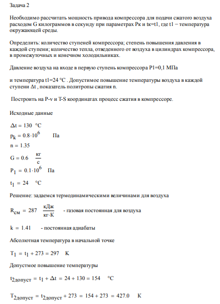 Задача 2. Необходимо рассчитать мощность привода компрессора для подачи сжатого воздуха расходом G килограммов в секунду при параметрах Pк и tк=t1, где…