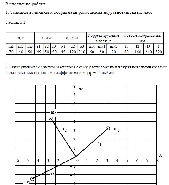 1. Производится расчет противовесов и их координат для уравновешивания ротора с известным расположением неуравновешенных масс.