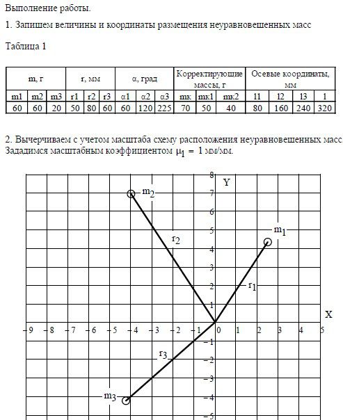 1. Производится расчет противовесов и их координат для уравновешивания ротора с известным расположением неуравновешенных масс.