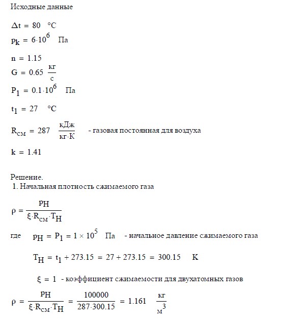 Произвести термодинамический расчет многоступенчатого поршневого компрессора, производящего G , кг в секунду сжатого до давления Рк воздуха, если предельно допустимое повышение температуры газа в каждой ступени Δt, а сжатие происходит с показателем политропы n.