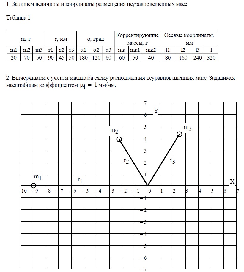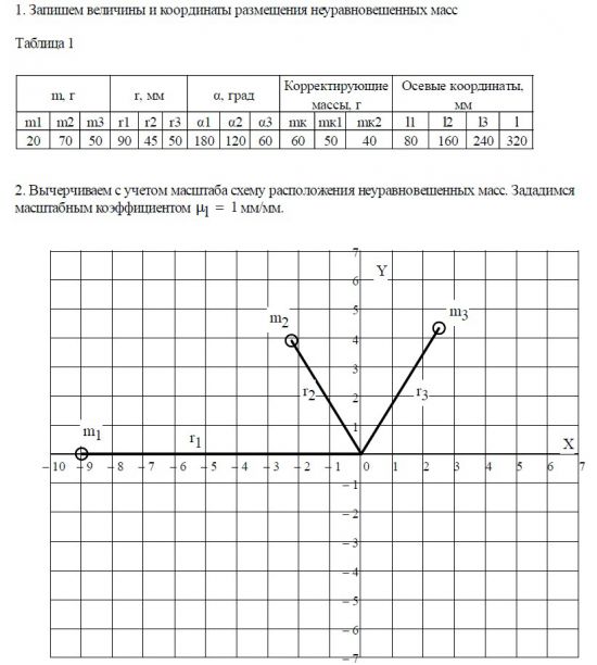 1. Производится расчет противовесов и их координат для уравновешивания ротора с известным расположением неуравновешенных масс.