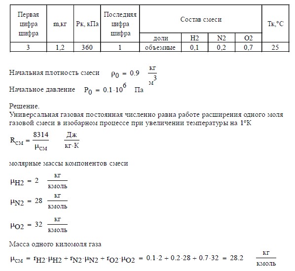 Газовая смесь массой m , имеющая начальную плотность 0,9 кг/м³, в ходе политропного процесса сжимается от давления 0,1 МПа до давления Рк. При этом ее температура достигает значения Тк.