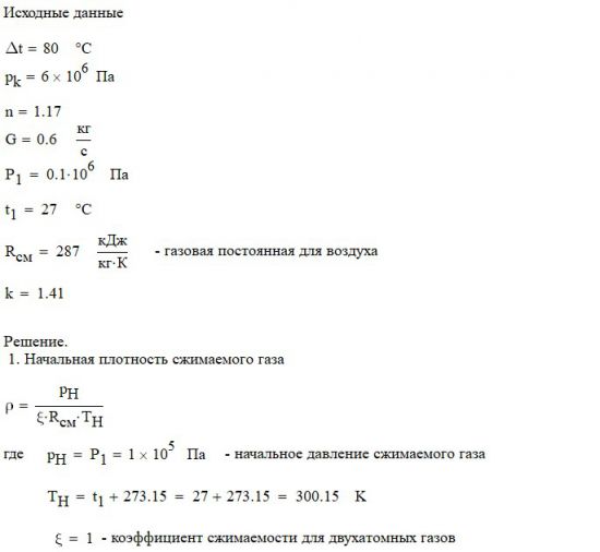Произвести термодинамический расчет многоступенчатого поршневого компрессора, производящего G , кг в секунду сжатого до давления Рк воздуха, если предельно допустимое повышение температуры газа в каждой ступени Δt, а сжатие происходит с показателем политропы n.