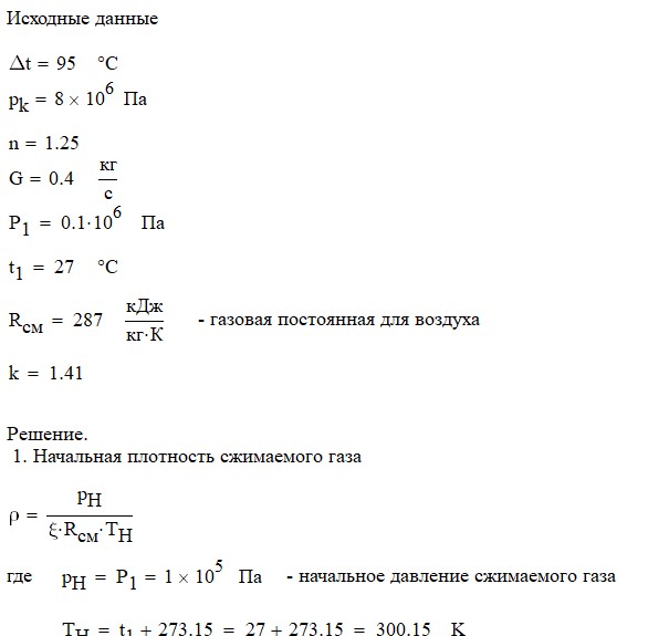 Произвести термодинамический расчет многоступенчатого поршневого компрессора, производящего G , кг в секунду сжатого до давления Рк воздуха, если предельно допустимое повышение температуры газа в каждой ступени Δt, а сжатие происходит с показателем политропы n.