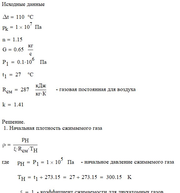 Произвести термодинамический расчет многоступенчатого поршневого компрессора, производящего G , кг в секунду сжатого до давления Рк воздуха, если предельно допустимое повышение температуры газа в каждой ступени Δt, а сжатие происходит с показателем политропы n.