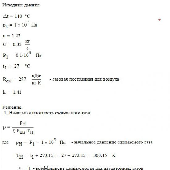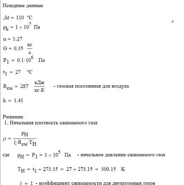 Произвести термодинамический расчет многоступенчатого поршневого компрессора, производящего G , кг в секунду сжатого до давления Рк воздуха, если предельно допустимое повышение температуры газа в каждой ступени Δt, а сжатие происходит с показателем политропы n.