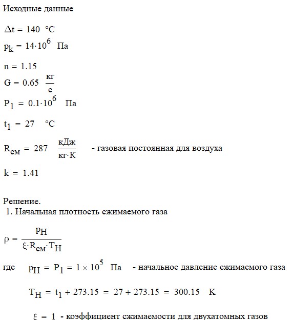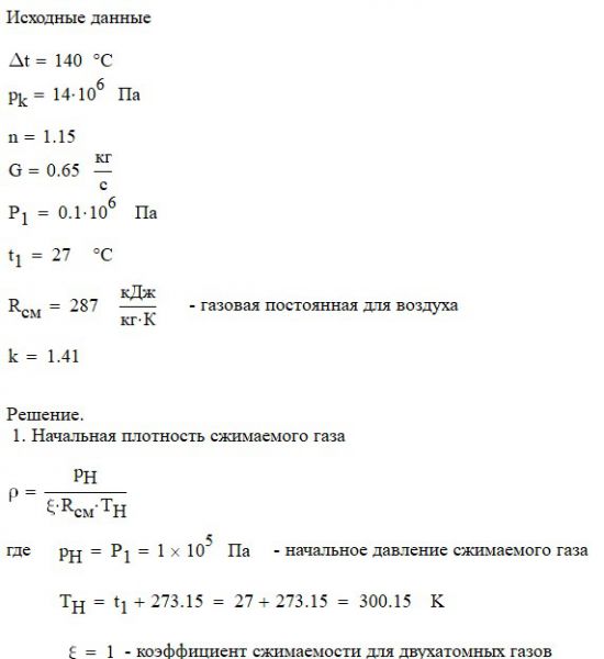 Произвести термодинамический расчет многоступенчатого поршневого компрессора, производящего G , кг в секунду сжатого до давления Рк воздуха, если предельно допустимое повышение температуры газа в каждой ступени Δt, а сжатие происходит с показателем политропы n.