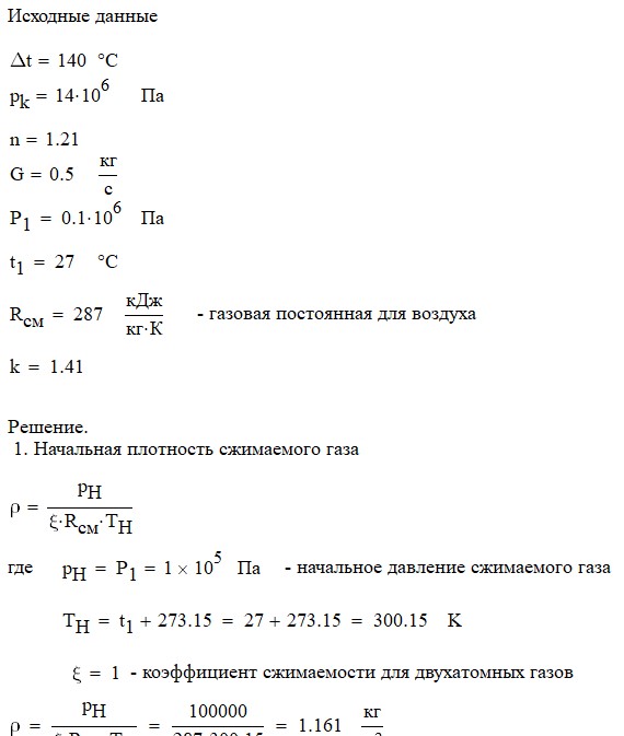 Произвести термодинамический расчет многоступенчатого поршневого компрессора, производящего G , кг в секунду сжатого до давления Рк воздуха, если предельно допустимое повышение температуры газа в каждой ступени Δt, а сжатие происходит с показателем политропы n.
