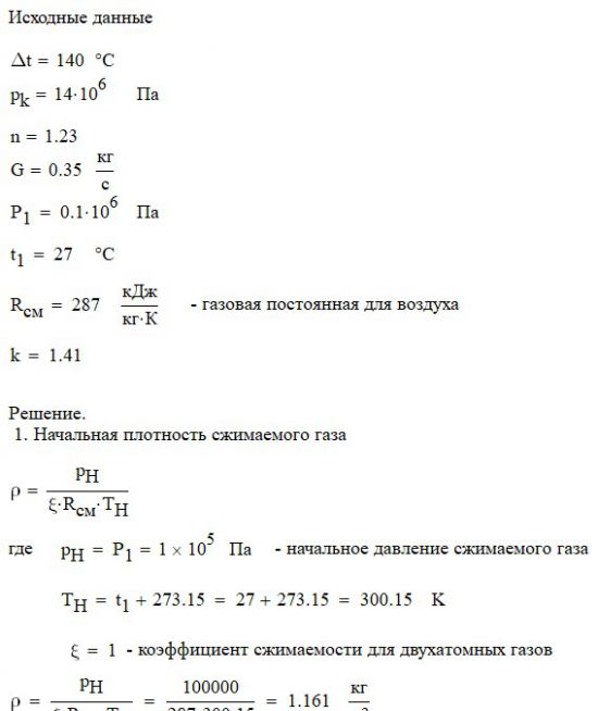 Произвести термодинамический расчет многоступенчатого поршневого компрессора, производящего G , кг в секунду сжатого до давления Рк воздуха, если предельно допустимое повышение температуры газа в каждой ступени Δt, а сжатие происходит с показателем политропы n.