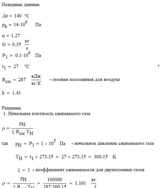 Произвести термодинамический расчет многоступенчатого поршневого компрессора, производящего G , кг в секунду сжатого до давления Рк воздуха, если предельно допустимое повышение температуры газа в каждой ступени Δt, а сжатие происходит с показателем политропы n.