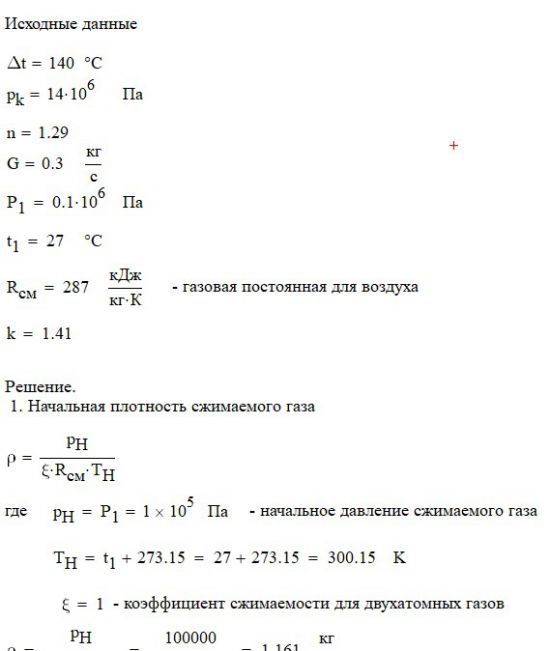 Произвести термодинамический расчет многоступенчатого поршневого компрессора, производящего G , кг в секунду сжатого до давления Рк воздуха, если предельно допустимое повышение температуры газа в каждой ступени Δt, а сжатие происходит с показателем политропы n.