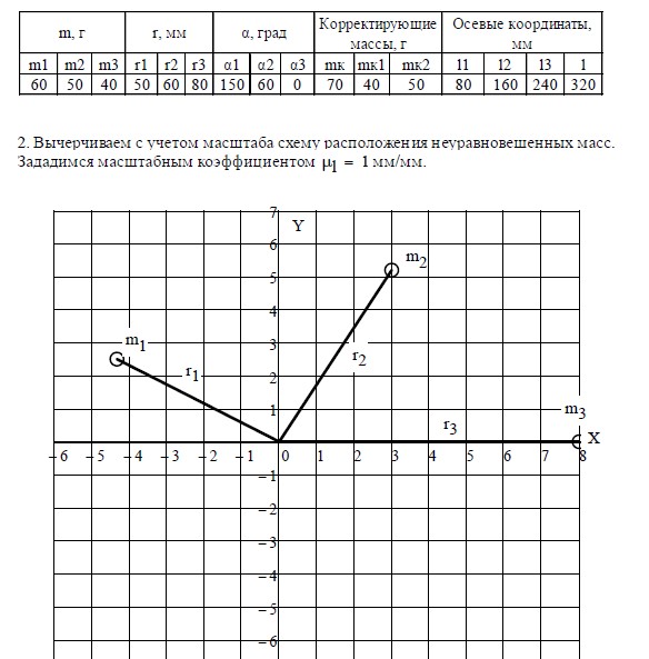 1. Производится расчет противовесов и их координат для уравновешивания ротора с известным расположением неуравновешенных масс.