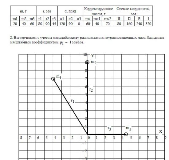 1. Производится расчет противовесов и их координат для уравновешивания ротора с известным расположением неуравновешенных масс.