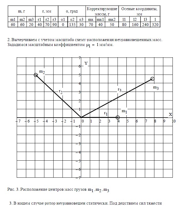 1. Производится расчет противовесов и их координат для уравновешивания ротора с известным расположением неуравновешенных масс.