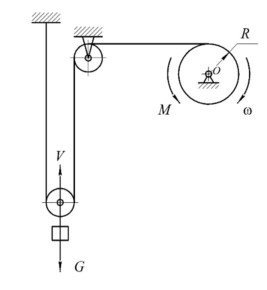 Груз весом G поднимается краном с полиспастом. В некоторый момент машинист отключает двигатель, срабатывает тормоз ТКТ-300 и на валу барабана 1 возникает тормозной момент , где R – радиус барабана, R =0,2 м. Определить путь, пройденный грузом до остановки, если момент инерции барабана равен I = 15 кг∙м2. Массой блоков и каната пренебречь.