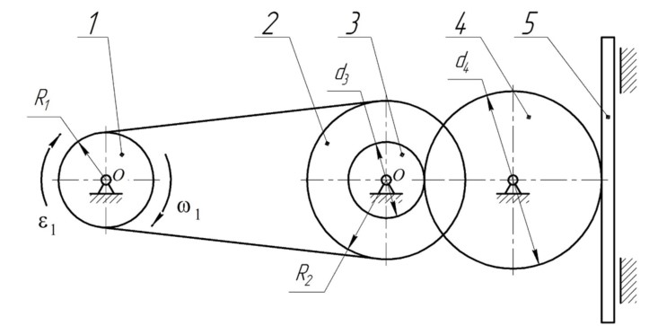 Определить скорость и ускорение рейки 5. Исходные данные принимаем из таблицы. Также найти мощность и крутящий момент на валу электродвигателя, который приводит в движение шкив 1 (на схеме не указан), если нам требуется преодолеть силу тяжести и силу инерции рейки 5 массой m5=100 кг. Массами остальных звеньев пренебречь.