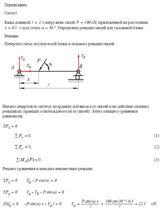Балка длинной м нагружена силой P = 100 кН, приложенной на расстоянии x = _____ м под углом a = ____. Определить реакции связей для указанной балки.