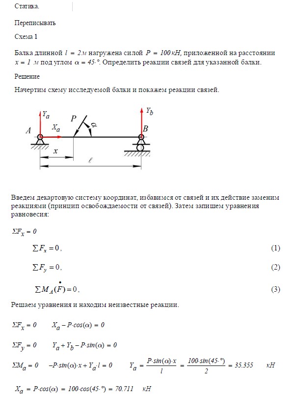 Задача 1. Статика. Схема 1 Балка длинной м нагружена силой P = 100 кН, приложенной на расстоянии x = _____ м под углом a =…