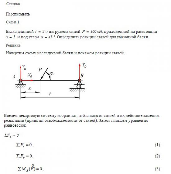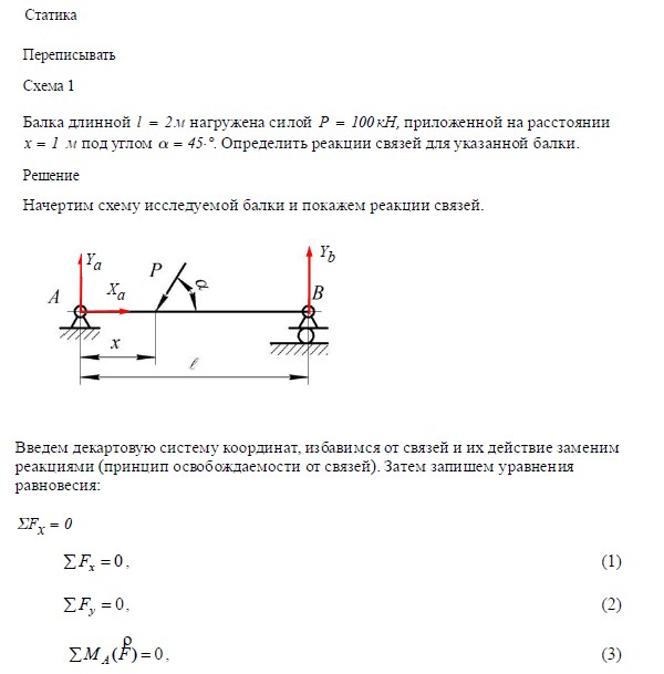 Задача 1. Статика. Схема 1 Балка длинной м нагружена силой P = 100 кН, приложенной на расстоянии x = _____ м под углом a =…