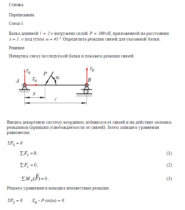 Задача 1. Статика. Схема 1 Балка длинной м нагружена силой P = 100 кН, приложенной на расстоянии x = _____ м под углом a =…