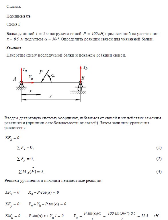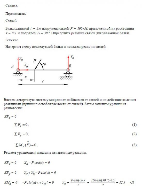 Задача 1. Статика. Схема 1 Балка длинной м нагружена силой P = 100 кН, приложенной на расстоянии x = _____ м под углом a =…