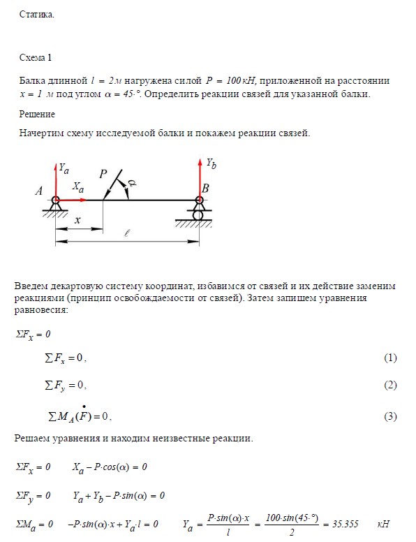 Задача 1. Статика. Схема 1 Балка длинной м нагружена силой P = 100 кН, приложенной на расстоянии x = _____ м под углом a =…