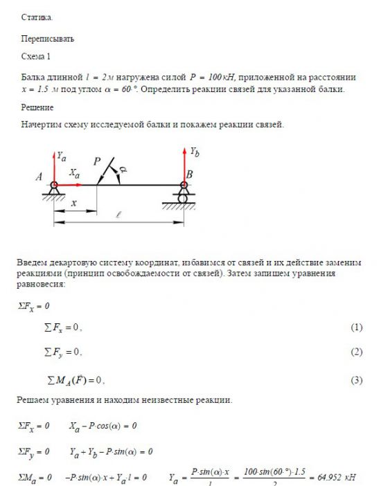 Задача 1. Статика. Схема 1 Балка длинной м нагружена силой P = 100 кН, приложенной на расстоянии x = _____ м под углом a =…