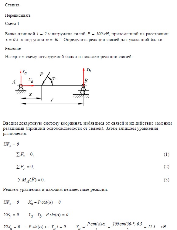 Задача 1. Статика. Схема 1 Балка длинной м нагружена силой P = 100 кН, приложенной на расстоянии x = _____ м под углом a =…
