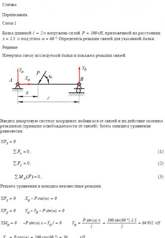 Задача 1. Статика. Схема 1 Балка длинной м нагружена силой P = 100 кН, приложенной на расстоянии x = _____ м под углом a =…