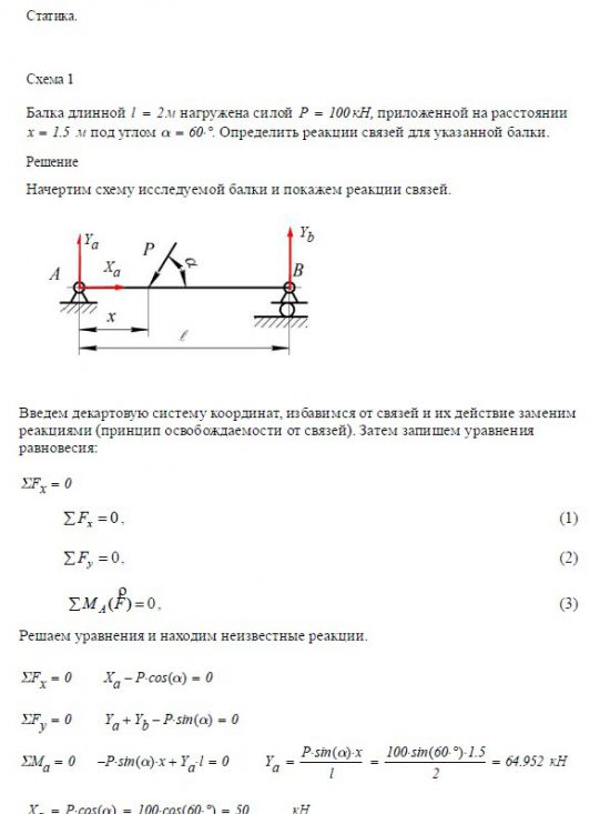 Задача 1. Статика. Схема 1 Балка длинной м нагружена силой P = 100 кН, приложенной на расстоянии x = _____ м под углом a =…