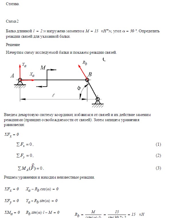 Задача 1. Статика. Балка длиной 2 м нагружена моментом М = _____ кН∙м, угол a = _____. Определить реакции связей для указанной балки. Задача 2…