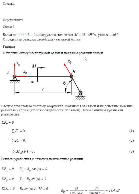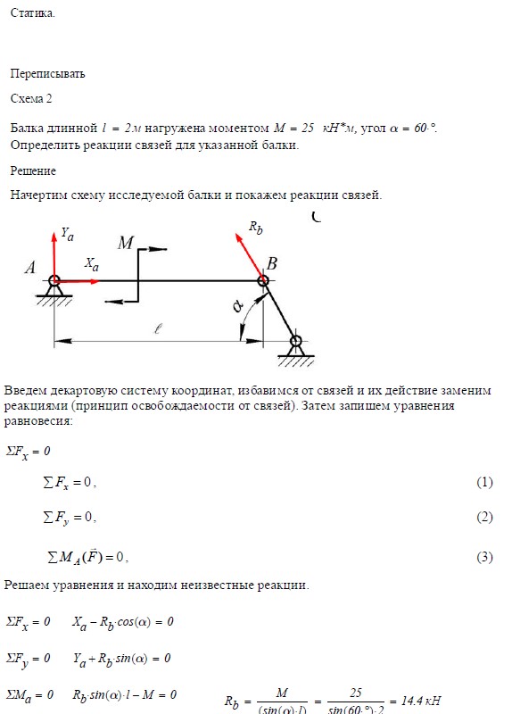 Задача 1. Статика. Балка длиной 2 м нагружена моментом М = _____ кН∙м, угол a = _____. Определить реакции связей для указанной балки. Задача 2…