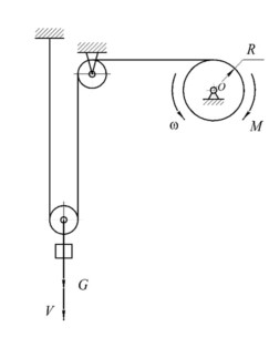 Груз весом G опускается краном с полиспастом. В некоторый момент машинист отключает двигатель, срабатывает тормоз ТКТ-300 и на валу барабана 1 возникает тормозной момент M=1.5*G*R , где R – радиус барабана, R =0,2 м. Определить путь, пройденный грузом до остановки, если момент инерции барабана равен I = 15 кг∙м2. Массой блоков и каната пренебречь.