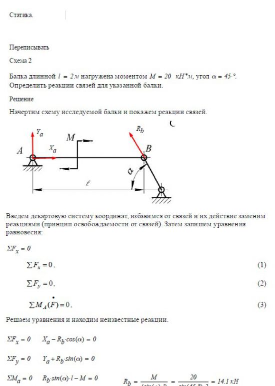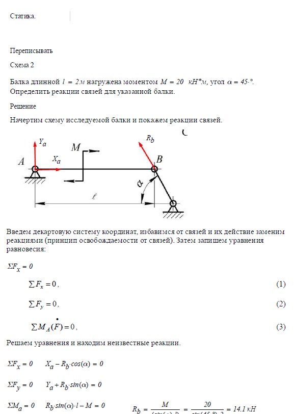Задача 1. Статика. Балка длиной 2 м нагружена моментом М = _____ кН∙м, угол a = _____. Определить реакции связей для указанной балки. Задача 2…