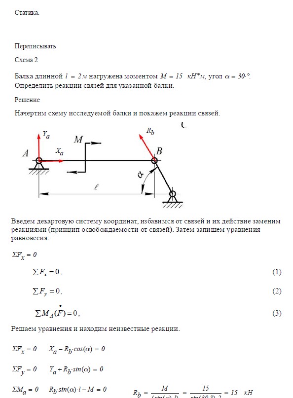 Задача 1. Статика. Балка длиной 2 м нагружена моментом М = _____ кН∙м, угол a = _____. Определить реакции связей для указанной балки. Задача 2…