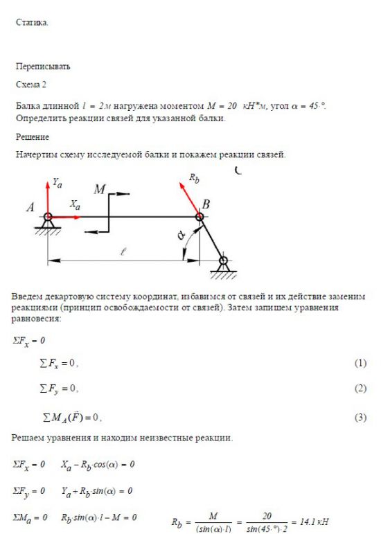 Задача 1. Статика. Балка длиной 2 м нагружена моментом М = _____ кН∙м, угол a = _____. Определить реакции связей для указанной балки. Задача 2…