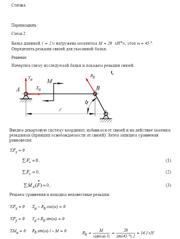Задача 1. Статика. Балка длиной 2 м нагружена моментом М = _____ кН∙м, угол a = _____. Определить реакции связей для указанной балки. Задача 2…