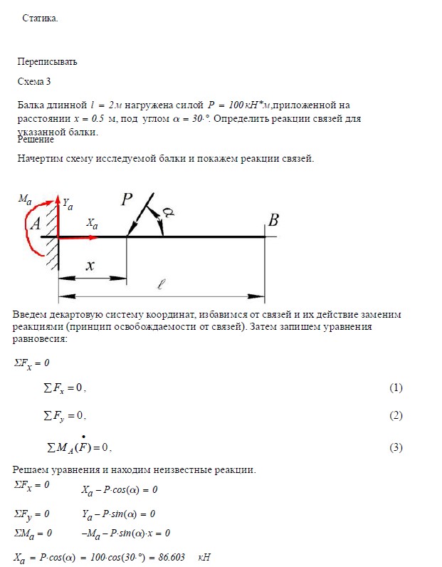 Задача 1. Статика. Балка длинной 2 м нагружена силой P = 100 кН, приложенной на расстоянии x = _____ м под углом a = ____. Определить реакции связей для…