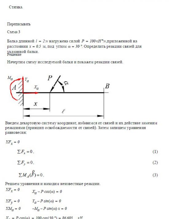 Задача 1. Статика. Балка длинной 2 м нагружена силой P = 100 кН, приложенной на расстоянии x = _____ м под углом a = ____. Определить…