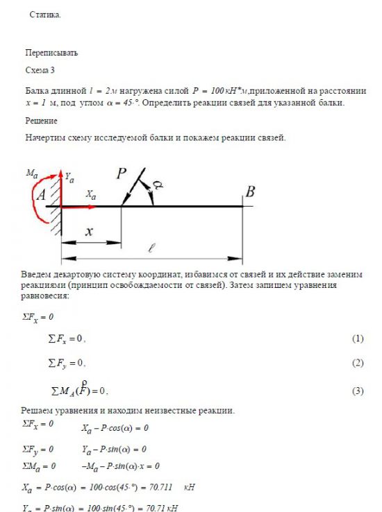 Задача 1. Статика. Балка длинной 2 м нагружена силой P = 100 кН, приложенной на расстоянии x = _____ м под углом a = ____. Определить…