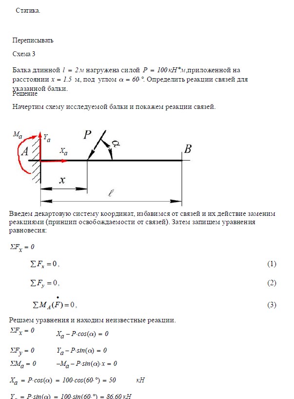 Задача 1. Статика. Балка длинной 2 м нагружена силой P = 100 кН, приложенной на расстоянии x = _____ м под углом a = ____. Определить…