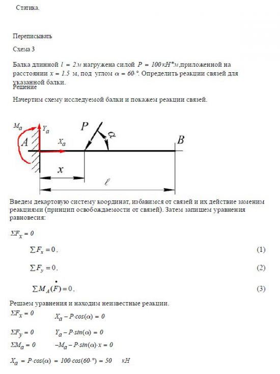 Задача 1. Статика. Балка длинной 2 м нагружена силой P = 100 кН, приложенной на расстоянии x = _____ м под углом a = ____. Определить…