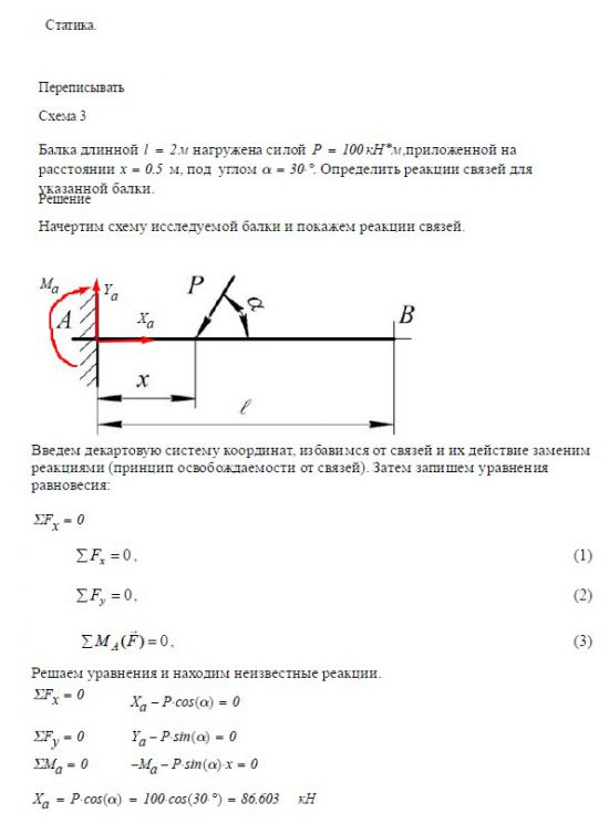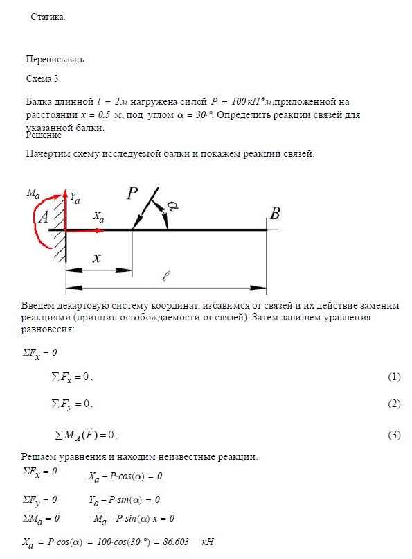 Задача 1. Статика. Балка длинной 2 м нагружена силой P = 100 кН, приложенной на расстоянии x = _____ м под углом a = ____. Определить…