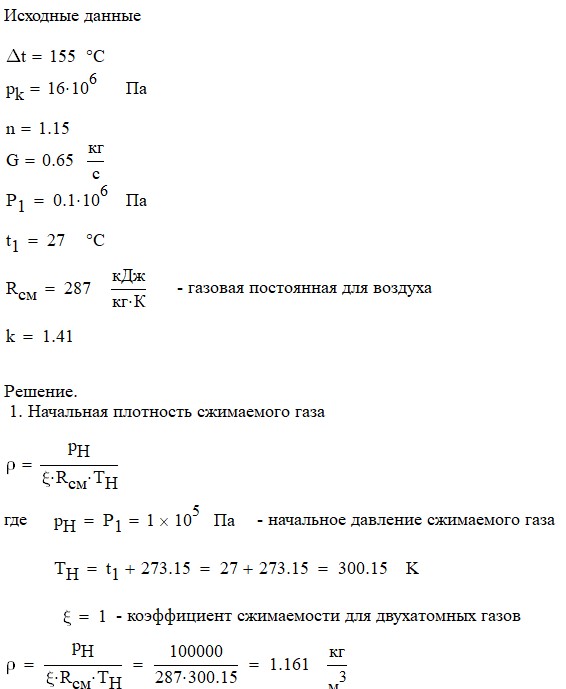Произвести термодинамический расчет многоступенчатого поршневого компрессора, производящего G , кг в секунду сжатого до давления Рк воздуха, если предельно допустимое повышение температуры газа в каждой ступени Δt, а сжатие происходит с показателем политропы n.