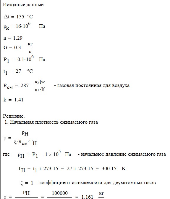 Произвести термодинамический расчет многоступенчатого поршневого компрессора, производящего G , кг в секунду сжатого до давления Рк воздуха, если предельно допустимое повышение температуры газа в каждой ступени Δt, а сжатие происходит с показателем политропы n.