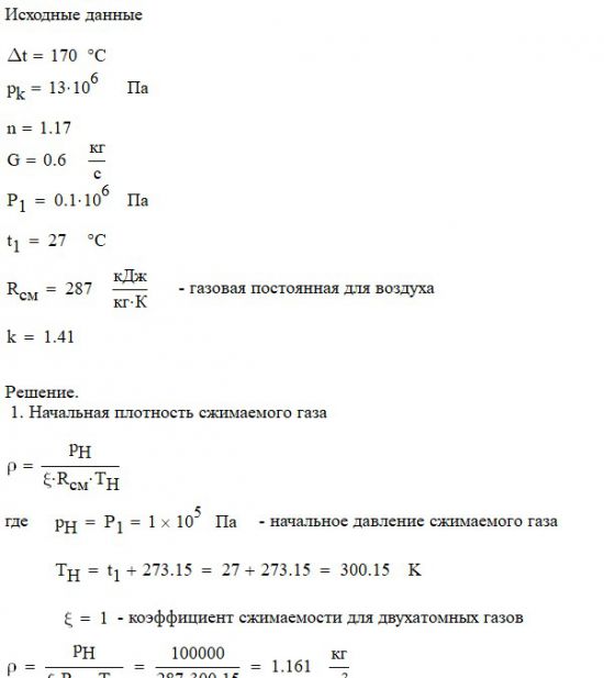 Произвести термодинамический расчет многоступенчатого поршневого компрессора, производящего G , кг в секунду сжатого до давления Рк воздуха, если предельно допустимое повышение температуры газа в каждой ступени Δt, а сжатие происходит с показателем политропы n.