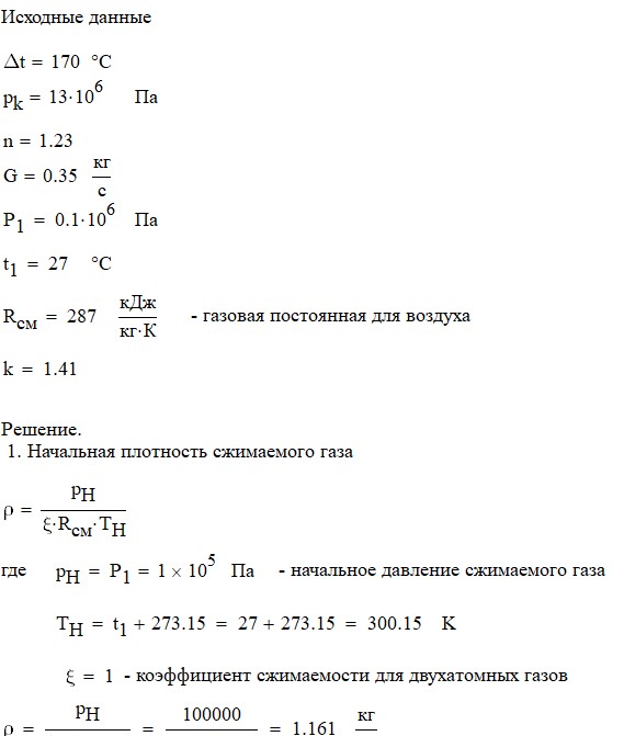 Произвести термодинамический расчет многоступенчатого поршневого компрессора, производящего G , кг в секунду сжатого до давления Рк воздуха, если предельно допустимое повышение температуры газа в каждой ступени Δt, а сжатие происходит с показателем политропы n.