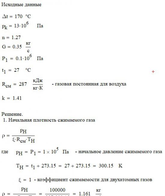 Произвести термодинамический расчет многоступенчатого поршневого компрессора, производящего G , кг в секунду сжатого до давления Рк воздуха, если предельно допустимое повышение температуры газа в каждой ступени Δt, а сжатие происходит с показателем политропы n.
