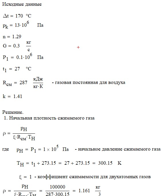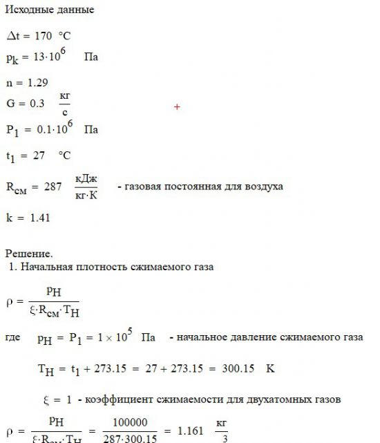 Произвести термодинамический расчет многоступенчатого поршневого компрессора, производящего G , кг в секунду сжатого до давления Рк воздуха, если предельно допустимое повышение температуры газа в каждой ступени Δt, а сжатие происходит с показателем политропы n.