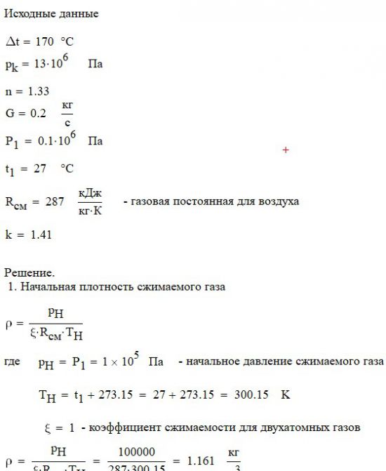 Произвести термодинамический расчет многоступенчатого поршневого компрессора, производящего G , кг в секунду сжатого до давления Рк воздуха, если предельно допустимое повышение температуры газа в каждой ступени Δt, а сжатие происходит с показателем политропы n.